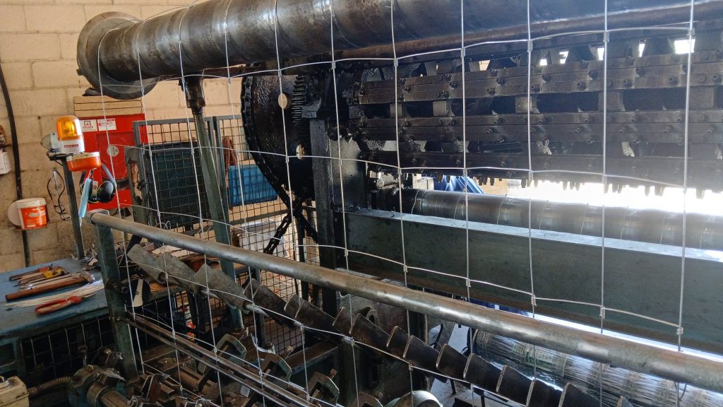 #162-216 Hurricane Hinge Joint Fence Machine; max. fence height: 55″(1.410 meters); max. number of line wires: 11; stay wire spacings: 6″ and 12″ (152 mm) (304 mm); line wire tensile: up to 34ton in2 (525 N/mm2) / 1.40″ top and bottom .110″ intermediate, 3.55mm top and bottom, 2.80mm intermediate; Up to 55 ton in2 (850 N/mm2), .110″-2.80mm; Up to 90 ton in2 (1 390 N/mm2) , .098″ -2.50mm; Stay wire tensile range: up to 34ton in2 (525N/mm2), up to 55 ton in2 (850 N/mm2); number of ‘strokes’ (stay wires) per minute: 6″ (152mm) 120, 12″ (304mm) 100; motor size: 15HP / 11KW; machine weight: 6.9 tons (7000 kgs)